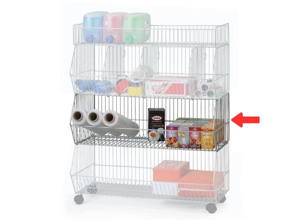 Možnosti rozšíření: Koš lze použít jako další patro na základní koš s kolečky, případně skládat více košů nad sebe. Sestavu můžete zakončit horní drátěnou policí a vnitřní prostor zpřehlednit pomocí drátěného děliče, který oddělí obsah do samostatných sekcí a zamezí promíchání zboží.