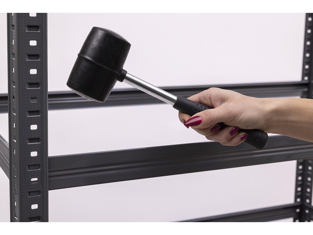 📌 Dřevěný mezikus: Při montáži bezšroubových regálů používejte dle návodu jednoduchou dřevěnou destičku/mezikus pro kolmé dorážení nosníků – usměrní náraz, sníží riziko šikmého dopadu hlavy paličky a ochrání nosník i lak.