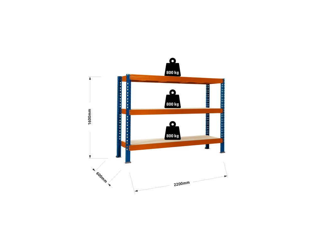 Nosnost 800 kg na polici, celková nosnost regálu 2400 kg – bezpečné skladování objemných i těžkých předmětů.