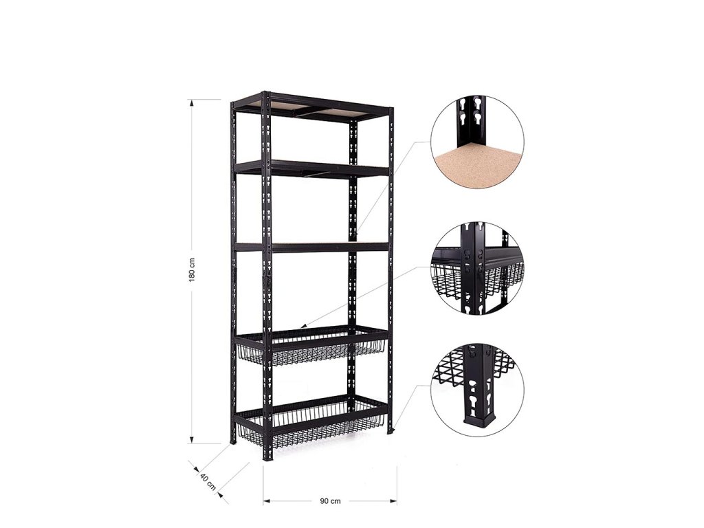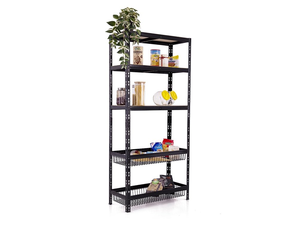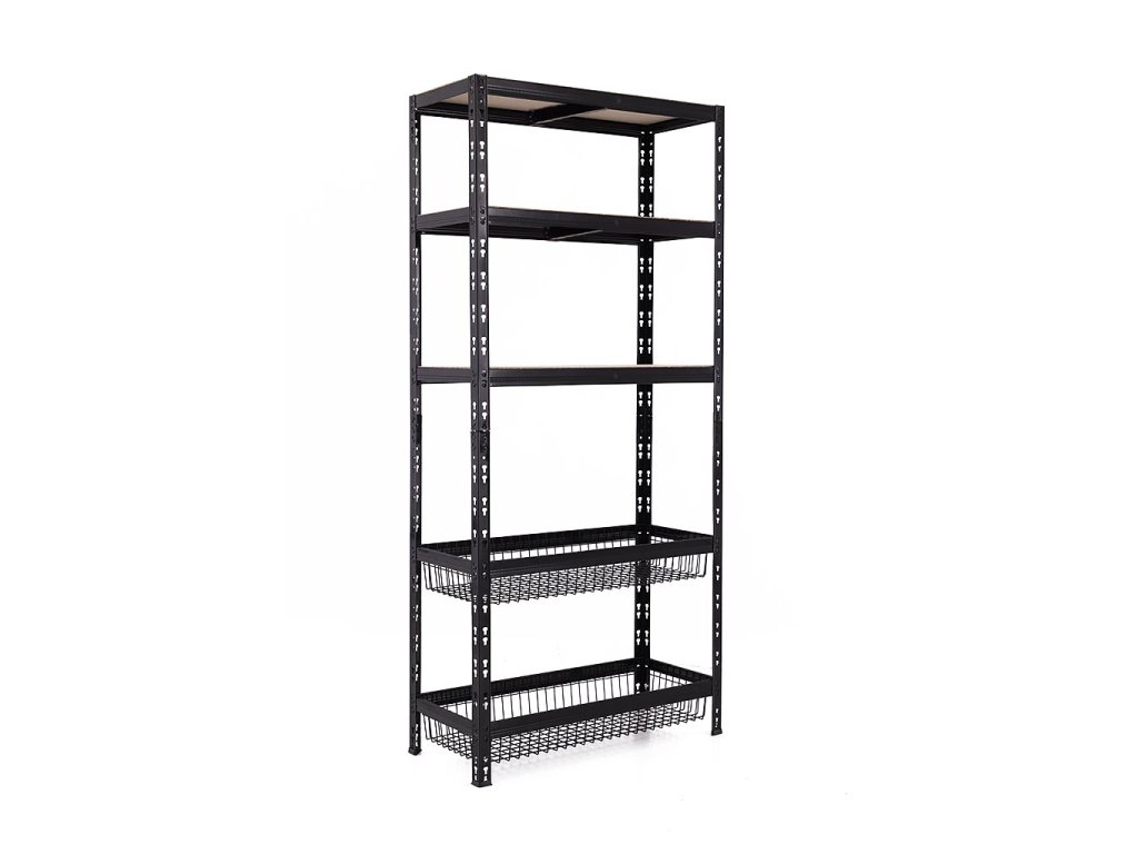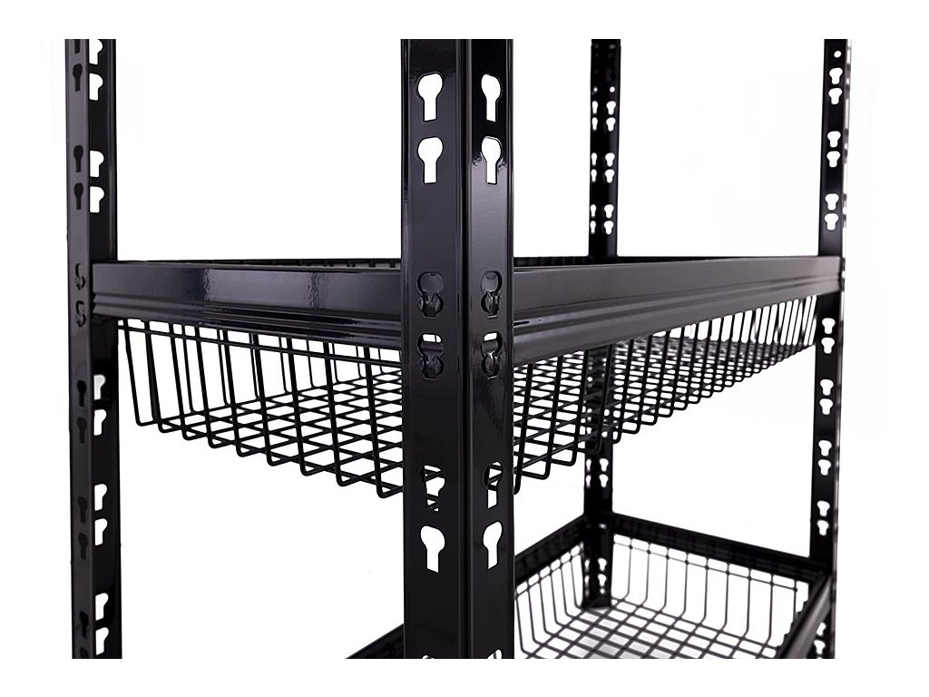 Policový regál Trestles RNDU-KCQ 1800x900x400, nosnost 625 kg, 3 police, 2 drátěné koše, černý