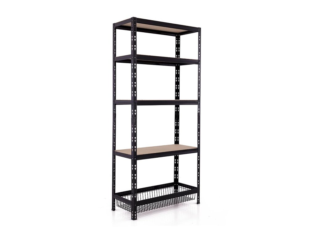 Policový regál Trestles RNDU-KCQ 1800x900x400, nosnost 750 kg, 4 police, 1 drátěný koše, černý