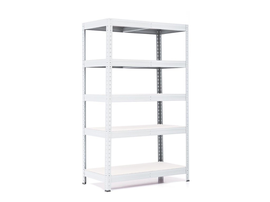 Každá z jeho 5 polic unese až 350 kg, což znamená celkovou nosnost až 1750 kg. Používáme kvalitní 5 mm MDF desky s bílým laminem na horní straně.