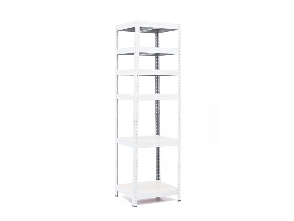 Každá z jeho 6 polic unese až 350 kg, což znamená celkovou nosnost až 2100 kg. Používáme kvalitní 5 mm MDF desky s bílým laminem na horní straně.