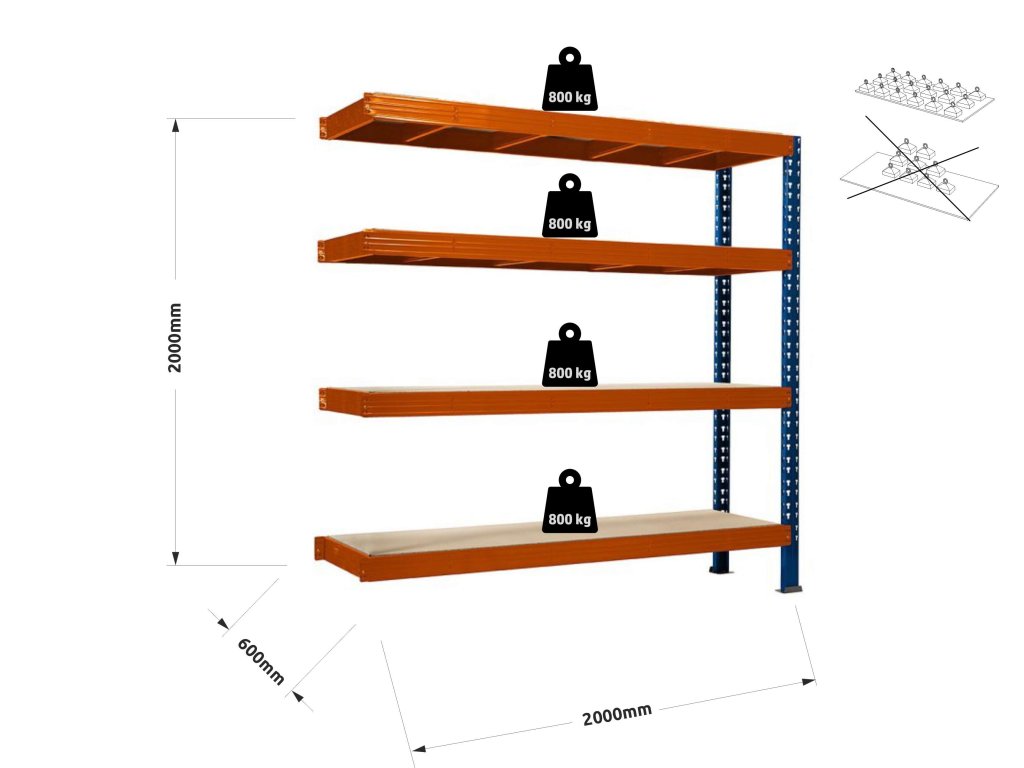 ✅ Nosnost 800 kg na polici, celková nosnost regálu 3200 kg – bezpečné skladování objemných i těžkých předmětů.