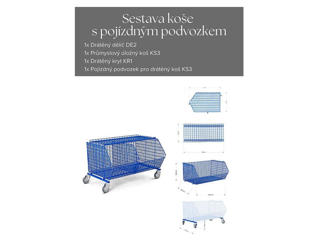 ✅ Výhodný set – 1x Průmyslový úložný koš KS3, 1x Drátěný dělič DE2, 1x Drátěný kryt KR1, 1x Pojízdný podvozek SJ1.